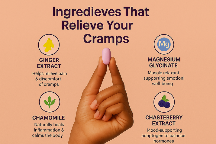 Answer 1: The product features a blend of magnesium and botanical extracts, combined with strawberry and rose flavors, carefully designed to provide effective cramp relief.